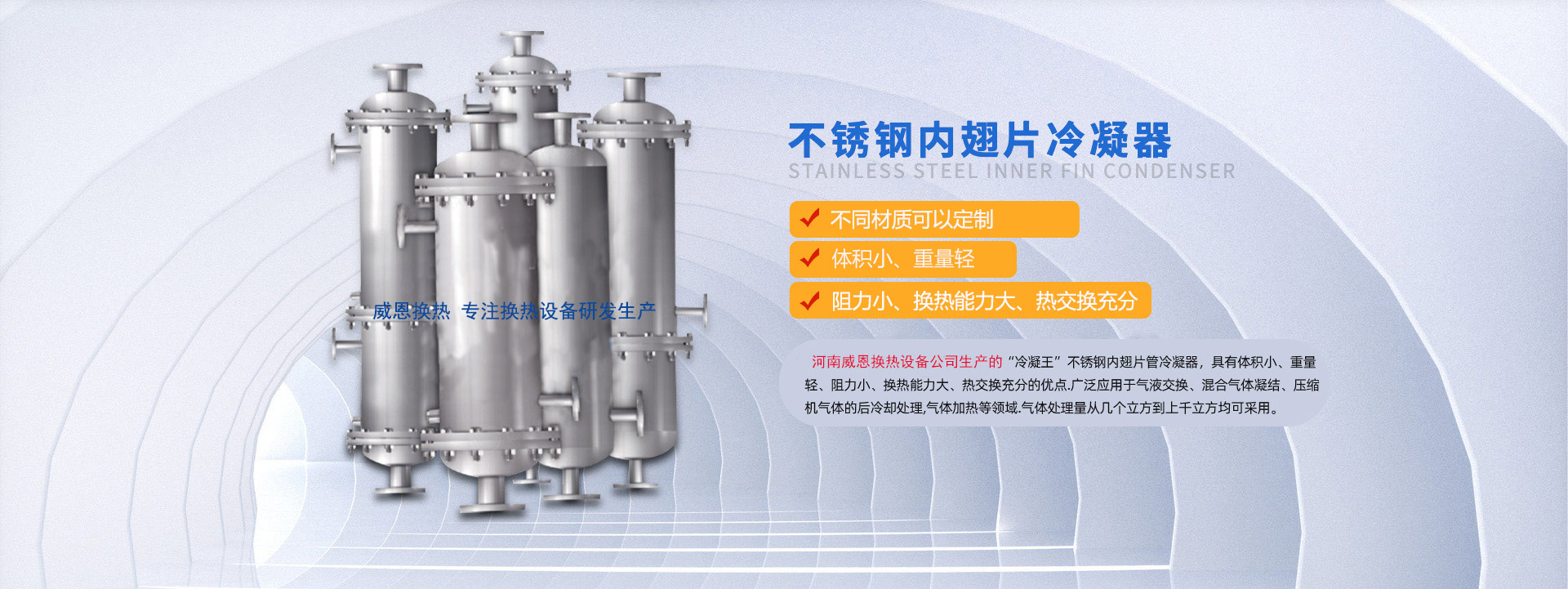河南威恩換熱設(shè)備有限公司是一家專業(yè)生產(chǎn)制造螺旋板式換熱器、列管式換熱器、節(jié)能換熱設(shè)備的廠家,集科研、設(shè)計、生產(chǎn)、銷售、工程安裝、調(diào)試為一體的技術(shù)型企業(yè)。公司成立以來一直致力于節(jié)能環(huán)保換熱設(shè)備的研發(fā)生產(chǎn),主要產(chǎn)品包括螺旋板換熱器、列管式換熱器、內(nèi)翅片冷凝器以及鋼制儲罐、反應(yīng)釜等的研發(fā)設(shè)計與銷售。公司研發(fā)生產(chǎn)的螺旋板式換熱器,傳熱效率高、可靠性高、阻力小、不易堵塞、可有效回收低品位熱能,已經(jīng)廣泛應(yīng)用到化學(xué)、石油、溶劑、醫(yī)藥、食品、輕工、紡織、冶金、軋鋼、焦化等行業(yè),取得了良好的效果,得到顧客的廣泛認(rèn)可和一致好評。針對制藥行業(yè),本公司生產(chǎn)的新型不銹鋼內(nèi)翅片換熱... 【了解更多】